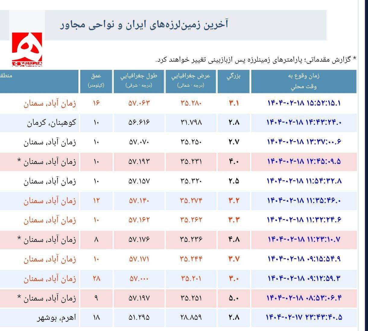 بنا به گزارش، شبکههای لرزهنگاری مرکز لرزهنگاری کشوری مؤسسه ژئوفیزیک دانشگاه تهران، ساعت ۰۸:۵۳ دقیقه صبح امروز پنجشنبه ۱۸ اردیبهشت سمنان لرزید.